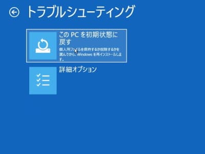 トラブルシューティング画面で、このPCを初期状態に戻すをクリックしてください。